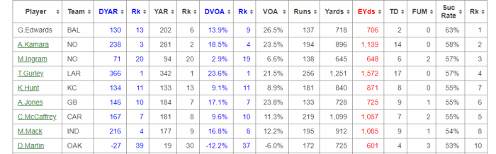 Last season Todd was 1st in DVoA and 4th in SR. Which is some high end stuff. The best in the league in big plays but also in the elite range for getting yards when he needs them: