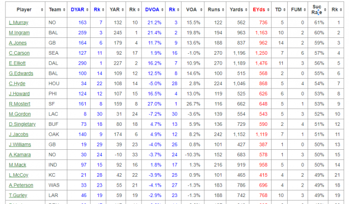 The dropoff is significant. I'm a big fan of SR (success rate) which tells you how often the back gets the yardage he needs on a given down. It can be compared to DVoA (which is big play rate) to determine whether the back busts big runs to pad his stats or whether he grinds out the tough yards.
