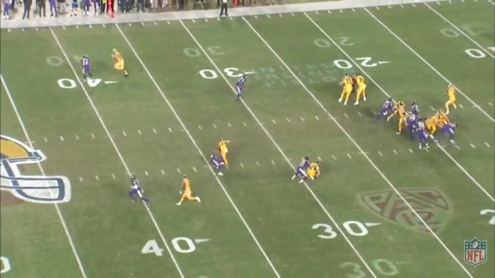 At the drop the OL is doing a fine job with 6 rushers but Goff knows he's gotta get this out quick
