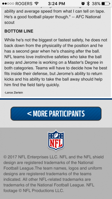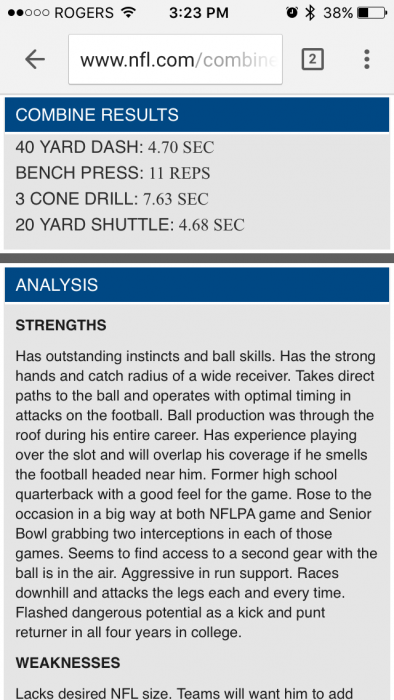 Instinctive ball hawking safety who also has elite return skills. We don't need him starting day one, but he's a perfect developmental prospect. Has a high grade, that will likely see him off the board in the 4-6 range. Solid value here.