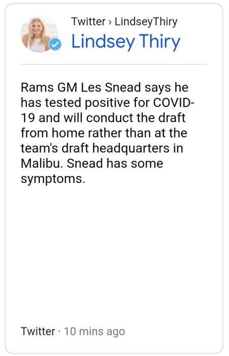 Let's pray for our guy Snead. Pretty terrible timing for the draft. Hope his symptoms are mild.