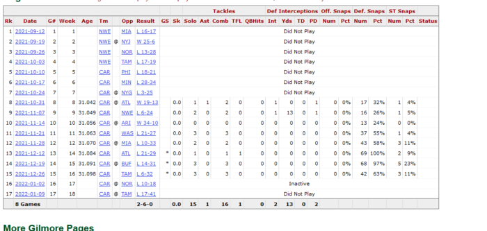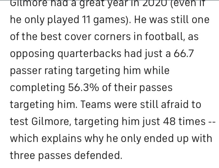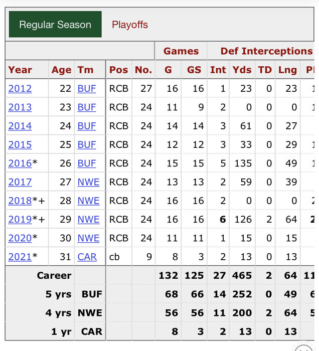 Last season 2021 Gilmore only played 21.8 % of Carolina's defensive snaps & was only healthy enough to start 3 out of 17 gms .View attachment 53366