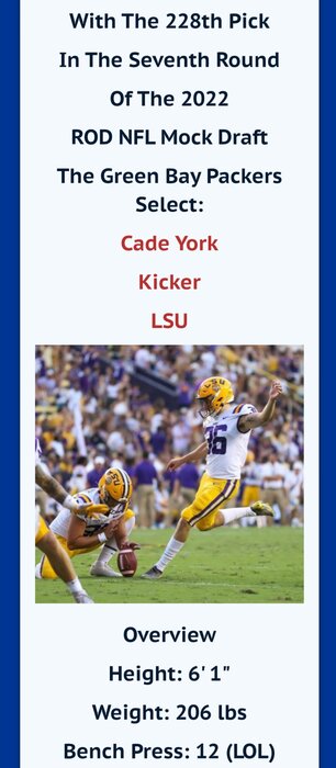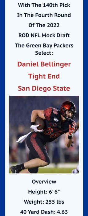 As Drafted ByI'm super happy with this draft. Green Bay just resigned Rodgers for his last shot at another Super Bowl in the twilight years of his career. This makes this an urgent Draft, to have a team that Rodgers can have immediate success with.