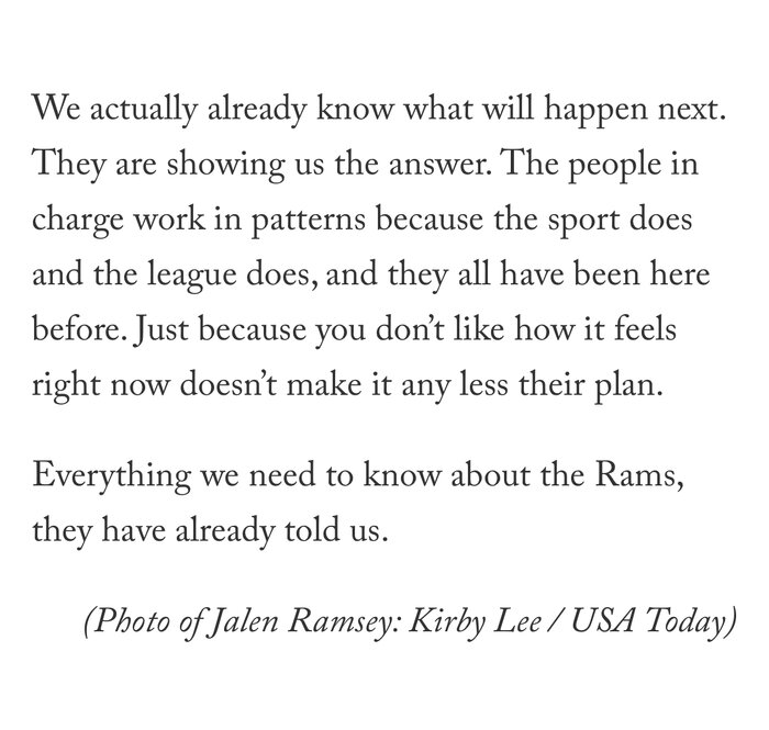 Maybe it’s because the Rams have lacked premium picks and don’t count on guys being ready in their first year, but they DID draft 2 CBs and 2 Safeties last year. Letting Rapp and Scott walk and trying to unload Ramsey were not ideas that just came up. The Rams were preparing for this.