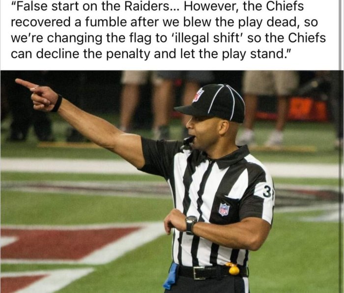 Actually, if you look at the video, the line judge quickly blew his whistle while the players were still fighting for the ball. He blew his whistle while running in, waved his arms then signaled false start. The back judge's job when there is a loose ball everyone's fighting for is to get right there in the scrum to try and determine who ended up with it. He clearly stopped assuming the play was dead. I don't know if it was truly a false start or illegal shift, but it was not a good look to change the call that gave the Chiefs the game. Especially when the Chiefs benefit from it. The perception has been all year that the refs aid the Chiefs.This is funny but they clearly called the play dead after the chiefs recovered the ball.