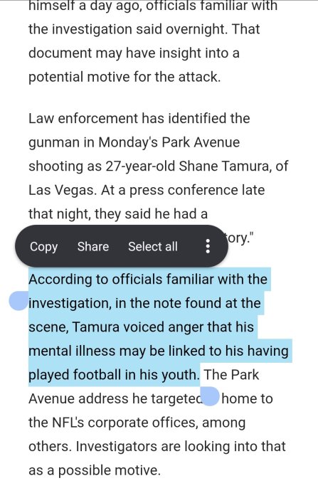 My comment on concussions suffered by HS kids and leaving them a little f'd up might be a timely comment based on the news out of Manhatten and the attack on what now appears to be the NFL offices.True, but maybe just a case of seeing the writing on the wall or maybe just burned out on football. My kid had friends that went on to play college football and a couple of them quit because they started to hate it. Two of his friends suffered from multiple concussions and my son said they were a little f'd up from it. It's a tough sport, a real grind. So you have to absolutely love it.