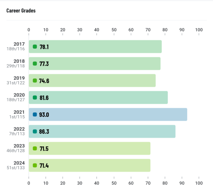 In his first six seasons, two were stellar and four were very good. The last two have been average. I love the memories, but he's being paid way too much to be average.