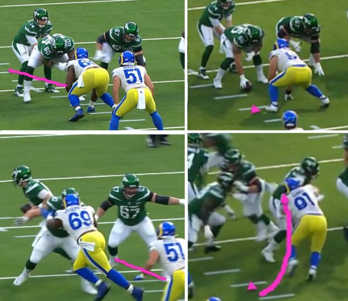This is the Staley/Fangio Penny front. Rams use it maybe 20%-25% of the time depending on game. The NT plays one gap based on the call. Sometimes it's toward the play, other times it's away. Sometimes it's a two-way go, his choice. He takes his gap and squeezes/helps/overlaps the gap next to him.