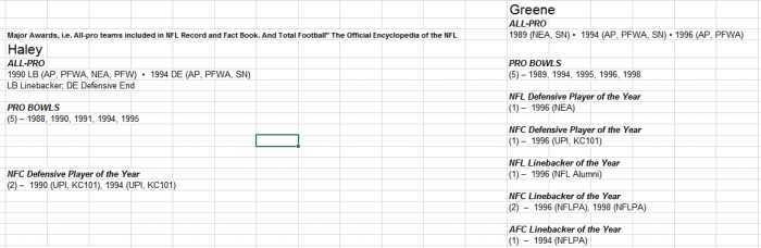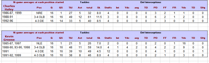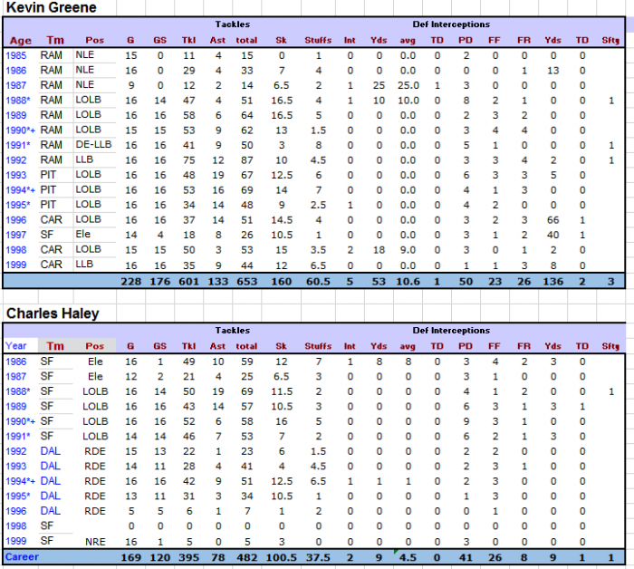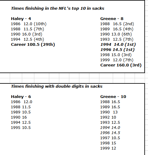 Now, I wanted Kurt get in today, but one guy you like, Haley got in. But Kevin Greene didn't. Look at their stats and see what you think.