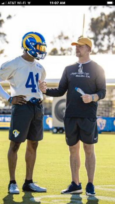 This brings me to the defense. I liked seeing our guys out there. Terrell Burgess looked really good. He had a nice pick on a dumpoff pass in the middle of the field (off of John Wolford). I'm glad Burgess is healthy. (On a side note, I saw some 13 year old with a #26 Burgess jersey. Respect, kid!). We saw #4 Jordan Fuller at left safety and #24 Taylor Rapp at right safety. It seemed to me that they were playing Rapp as more of a free safety and Fuller as more of a strong safety, though my understanding is that the Rams scheme doesn't really designate a SS vs. FS. The defense was already doing a good job of disguising their defense, often looking like cover-4 at the snap, but it was a cover-3 concept or sometimes Fuller would be a robber. The outside corners would play with outside leverage sometimes on cover-2 man concepts, which made it look like some sort of cover-3 zone presnap, so I liked what they were doing.