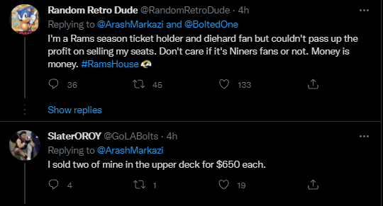 Fucking assholes, I'd make sure they'd only go to Rams fans if I were selling them. Unfortunately for me, I have a taste for a better view with my crappy vision lolYea but look at these fake ass fans man. Buy season tickets just to sell them when your team makes it to the NFCC game. Sucks we dont have a legit fanbase yet. I think it will be close to 50/50 again at SoFi which is unfortunate.