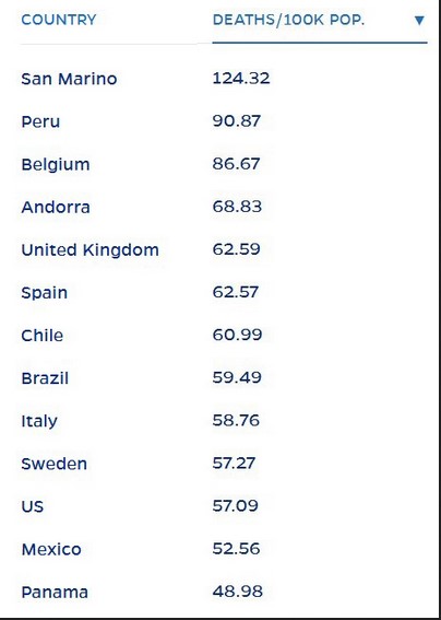 The Chart you referenced above is a little further down the first page of the same link. It also has a column for Deaths per 100K Population. The U.S. is the 11th worst on that Chart. There are 170 countries listed on that Chart.