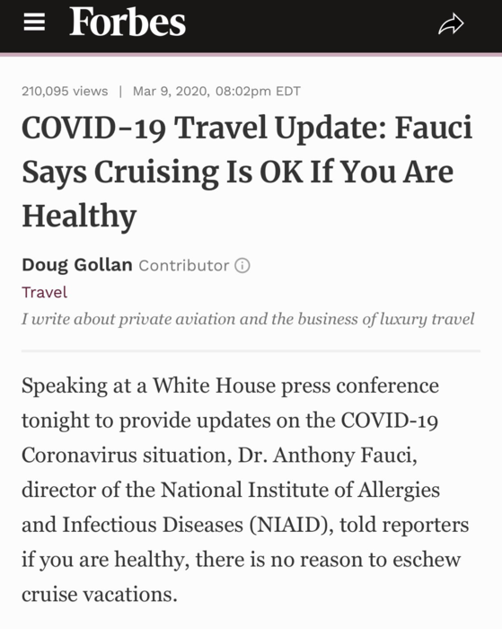 I mean, if the good Dr. Fauci is proclaiming as late as March 9th that it's ok for the healthy to immerse themselves in the petri dish of a cruise ship, then do you think maybe that sent a message that widespread testing wasn't that urgent of a concern? He's held up as an expert and yet he did say these things. Is not a little bit of skepticism warranted?