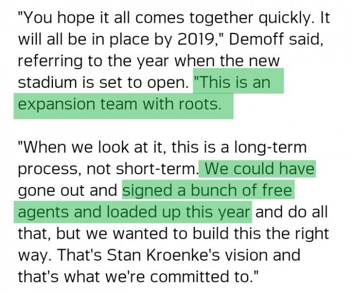 "You hope it all comes together quickly. It will all be in place by 2019," Demoff said, referring to the year when the new stadium is set to open. "This is an expansion team with roots.
