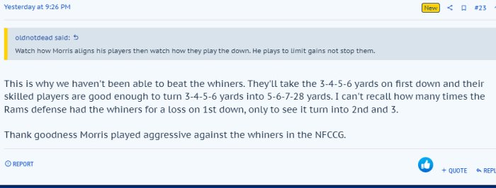 This is why we haven't been able to beat the whiners. They'll take the 3-4-5-6 yards on first down and their skilled players are good enough to turn 3-4-5-6 yards into 5-6-7-28 yards. I can't recall how many times the Rams defense had the whiners for a loss on 1st down, only to see it turn into 2nd and 3.