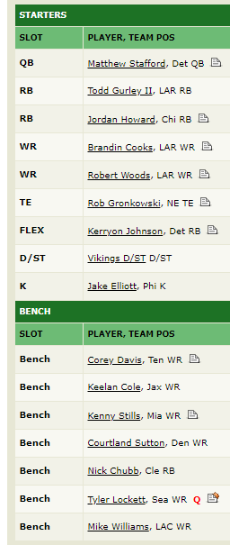 My league's picks were...odd. I had a strategy to hoard all the starting and potential starting RBs I could get, get the best TE, at least one top WR (our Brandin Cooks). Rest go WR heavy, only breaking for Matthew Stafford b/c there was a run on QBs like Ben, Matt Ryan, etc.