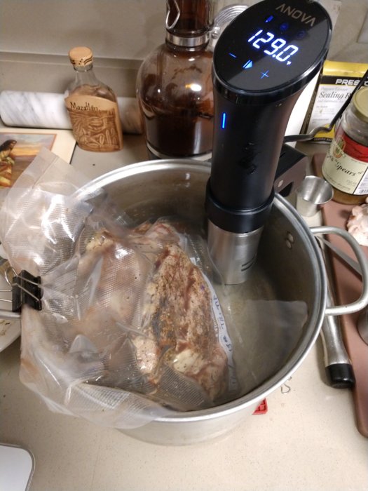 Just got a sous vide unit so I'm playing with all kinds of stuff. Did thick cut pork chops last night. Doing baby backs right now that I'm going to baste with my slather sauce and then torch for a slight char.