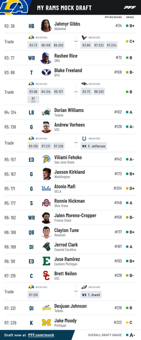 I'd love Gibbs but I don't think he makes it anywhere near #36. And if the Rams feel the same way but don't want to trade up to get him, they may have their eyes on somebody else. I'm thinking Charbonnet. Good runner. Good receiver. Played in their own backyard. My other choice would be Kendre Miller. I want one of the top RBs on this team in 2023.