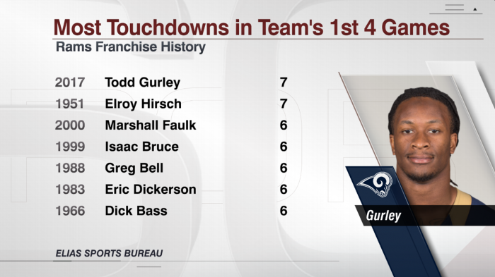 Gurley's 7 TD's in his first 4 games Ties a Ram Record held by 'Crazy-Legs' Hirsch!! That's one "Old Record"!!