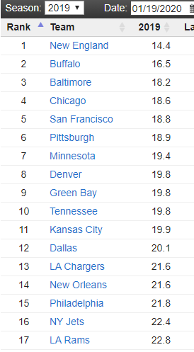 I don't want to hijack this thread. But here is the list of the season points allowed and you can see the Chiefs are in the top third, due to 3 teams being tied at 19.8 points allowed. Used to be you wanted a sub-19 ppg defense to give yourself the best shot in the playoffs. Now it's moreso 20 ppg due to the rules changes favoring offense as it does.
