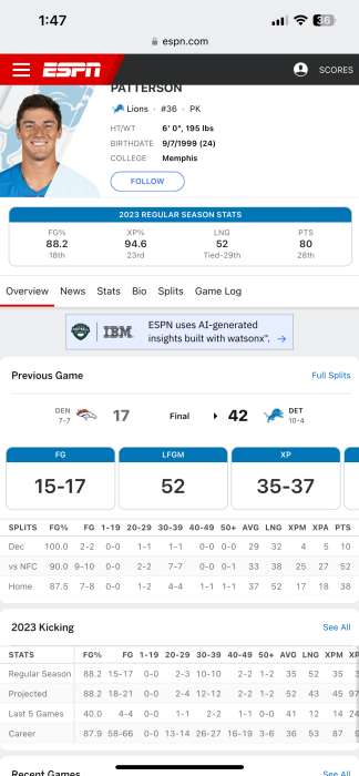 Patterson was inactive on December 17, 2023, due to 2 extra point missed in his last 3 games. He was replaced by Michael Badgley. On December 19th, Patterson was waived by the Lions.