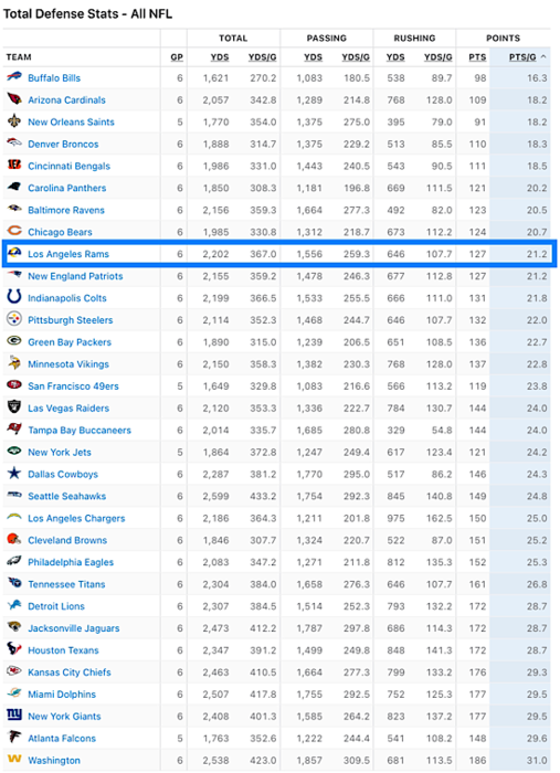 The only three teams ahead of Los Angeles in DVOA on defense this season are the Buffalo Bills, the Arizona Cardinals, and the New Orleans Saints. While the Rams have posted a 5-1 record in the ledger, they are allowing 21.2 points per game, which is ninth in the NFL.