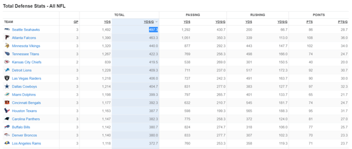 Rams are 3rd in yards per game over 3 games with maybe the worst defense coming up week 4 in the Giants and several other bad defenses after that including the Seahawks who have the worst defense in the NFL giving up 497.3 YPG.