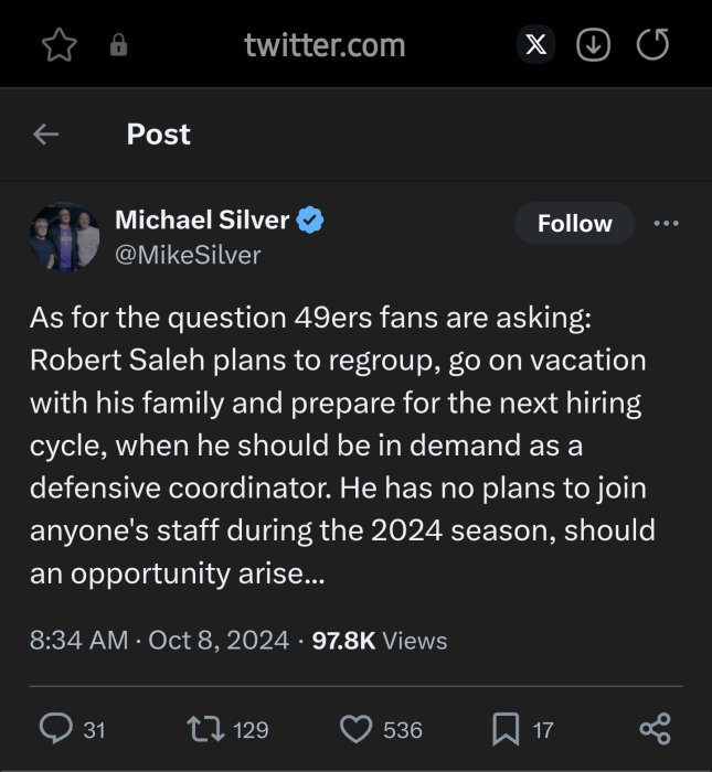 Not this year and I would be shocked if he went back to San Francisco, he will look for another opportunity with another organization IMHO and if the Rams decided to open up the DC job, he would be a possibility IMHO.Won't happen guys