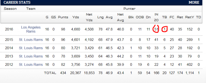 He just turned 27 in Feb. Punters seem to get better with age. I don't know when they hit their prime but, can you imagine him having a better year. I would not bet against him but,dang 51 punts inside he 20 with only 1 touch back in 98 punts. Net average of 46 is better than most punters average punt. Fassel and special teams get a big assist.