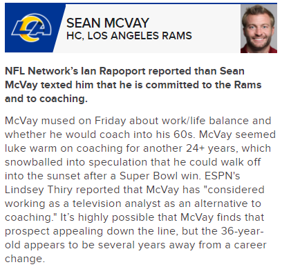 In January, multiple league executives suggested to ESPN's Jeremy Fowler that McVay could follow a similar coaching/broadcasting path to Jon Gruden, whom McVay coached under in Tampa Bay in 2008, and take a break from coaching for a lucrative TV job.