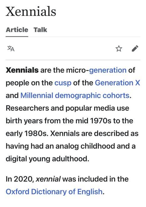 A reminder, the halfway generation between the Milenials and Gen X= Xennials. I was born in 1980 and don’t relate to the fucks at the end of the generation.