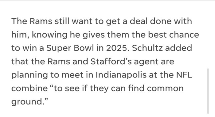 I doubt he's wrong about them meeting up during the combine time period. It's usually a great time to gauge where talks are at. Besides the combine is literally one week away. Like all media, its a guess and probably isn't that far off. In relation to the salary cap hit info, while appreciated, I wasn't even referring to that at all lol. Using that info to boost up Jourdan is weird to me when I once never mentioned her. Are you telling me she's the only media person that may get anything right about Rams business? Now that's funny. Honestly with media its always a guessing game. By the way, there's an article like this under the Athletic (not supposed to post paid subscription stuff on here) where Jourdan basically assumes the part I posted about Jordan Schulz expecting talks to continue during the combine time. Probably should check that kinda stuff out before comparing the two before bashing with so much confidence lol