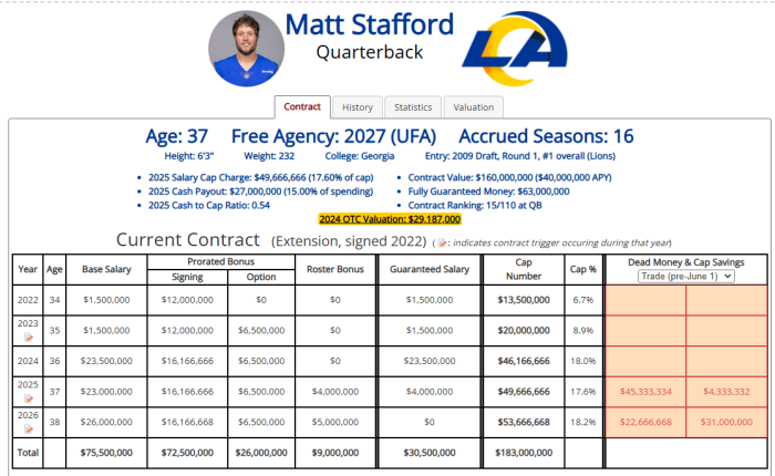 Matt Stafford contract and salary cap details, including signing bonus, guaranteed salary, dead money, roster bonuses, and contract history