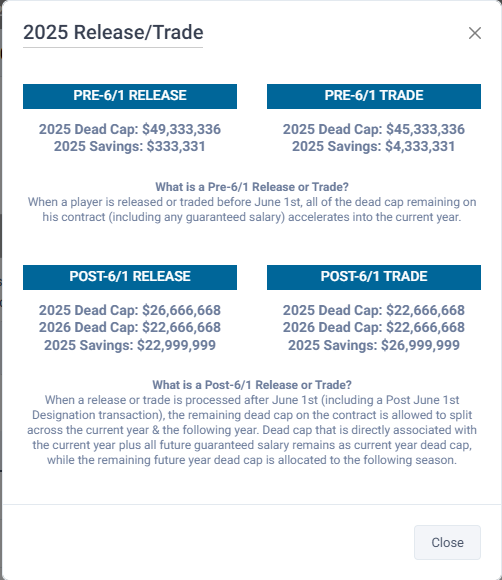 Schultz talks about an additional nearly $23 million in 2026 - a cap hit in 2025 "and" a cap hit in 2026. This $23 million is the dead cap for a pre-June 1 trade in 2026. The prorated bonuses in 2026 add up to $22,666,668. A pre June 1 2025 trade would accelerate both the 2025 bonus money and 2026 bonus money to year 2025. The Rams won't get dinged twice for the 2026 prorated bonuses. OTC doesn't nicely display things . . . like Spotrac does: