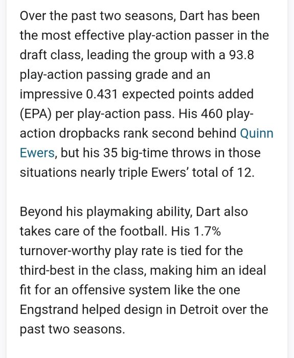 I guess it depends if McVay doesn't mind that it's a half-field read offense and he wasn't taught to go through his progressions and rarely if ever looked off his first read (though it's an offense that is all about trying to make that first read a gimmie). It's a decent pre-snap processing offense but then he didn't do any post-snap processing and either threw to his first read or took off. His lack of post snap processing (not even progressions) seems slow and he seems late on throws a lot.Back to Dart, if these stats are correct, this guy sounds like a fit with McVay