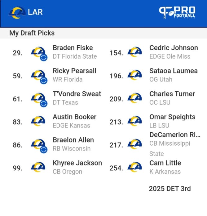 This also got a 2025 3rd from Detroit. This draft failed to get an OT, but with Boom back I didn't focus on that.