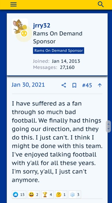 Dark times on the STL Dispatch forum back then. The Warner vs Bulger arguments of 2002 into the whole 2003 season were about at partisan as it gets. And the fuel for a lot of it was Brenda Warner’s comments on how poorly the Rams treated him. Dark times.