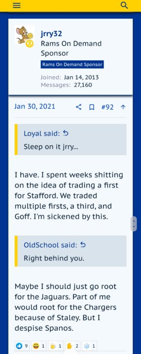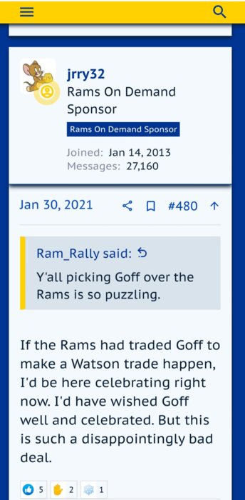 I think the opposition to the Stafford deal was a derivative of the fantasy GM’s thinking they evaluate talent better than Snead/McVay. They saw a younger Goff who, with great help from McVay, led the Rams to Super Bowl 53, a loss. They couldn’t separate Stafford from the disfunction of the Lions organiization and his capability to do much more than Jared, resulting in McVay “letting go” so Matthew could make that final gutsy drive to win Super Bowl 56.