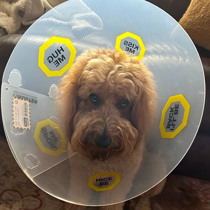 You can see his look of pitifulness in his eyes. Hell, his fro is even flat from the damn cone. Poor boi...