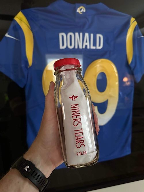 I am thinking every time we play the 49'ers... I am filling a bottle with something to drink after each win.