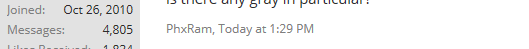Where it says, "PhxRam, Today..." and Joined and Messages. Those areas. Again, my computer every now and then just decides to do things like lighten menus, reply boxes, and stuff like that so consider the source. If no one else is having that issue then it is probably my POS.