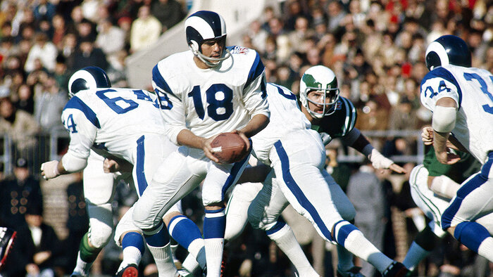Eight year old boy comes in from playing outside, and his dad was watching a Rams-Vikings game on a black and white, portable TV with a 9" screen. Kid sits down on the floor and asks "Who is playing?"