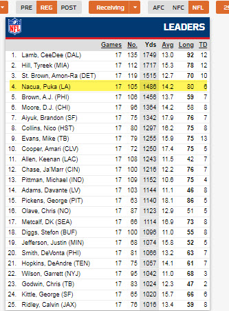 When I want the games and starts and so on ... PFR is the place. When I want something five minutes after the game or an hour to get answers to questions I have, like maybe "Hey where does Puka rank in receiving yards"