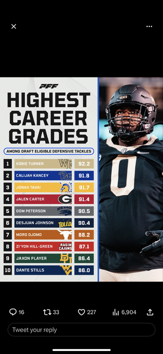 Yeah, PFF is in love with him, which sounds good to me. With a Pass Rush win rate of 14.7% and a Run Stop Rate of 11.5%, both are I believe 85-90% of the whole class. Pretty excited by this guy and, really, where else would a guy named Kobie thrive?