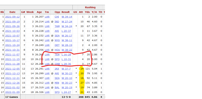 Actually I just searched....Here is that 3 game loss streak showing Sony Michel's carries folowed by 5 straight wins with Sony avg over 20 carries a game. I think this is when the light went on for Mcvay and it made the game easier for Stafford as well.