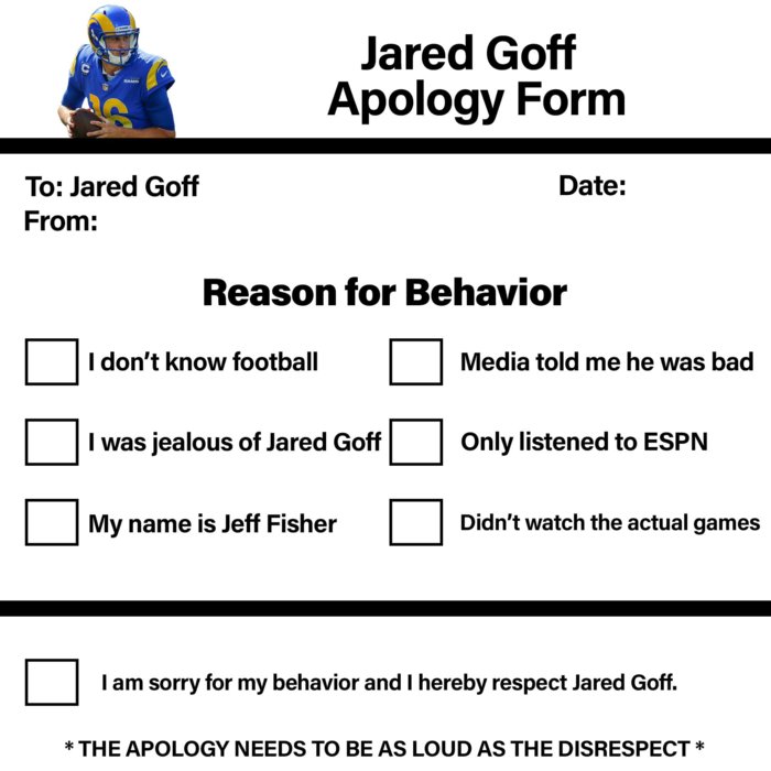 You're just mad because you got one of those apology forms in your mailbox.I love Goff. I'm absolutely fine with him. You're right. He isn't as terrible as the media would have us believe. But let's not get carried away and be homers, haha.I'm a 45 year long Ram fan so far so I can say the following. Jared Goff is NOT even in the top 10 QBs this season. But I wouldn't trade him for anyone either.