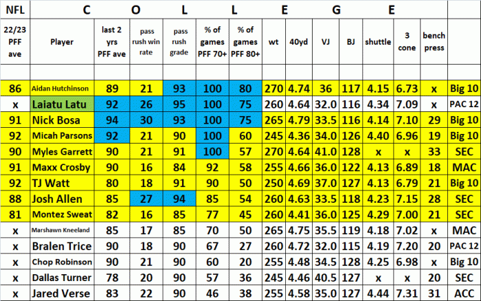It's possible there are no super elite edge defenders in this class. Here is a chart from PFF showing numbers for some edge defenders from this class versus top NFL edge defenders. Note that several are below 7.0.