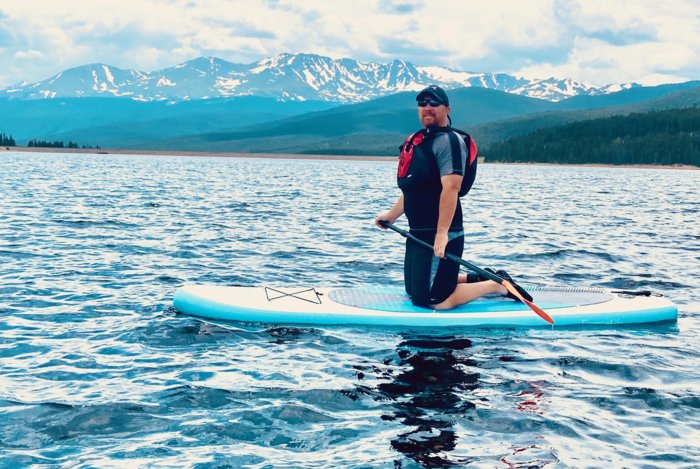 Paddle Boarding Turquoise Lake outside of Leadville Colorado. It looks calm but the wind was gusting on the water about 15 mph.