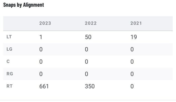 Now consider that they have a 4th yr decent LT, who will be a FA next yr, and a 33 yr old RT who is only above avg at this point.