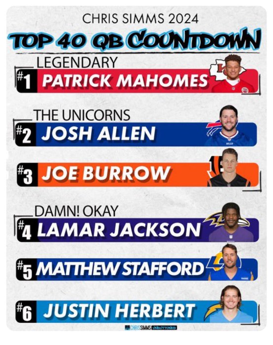 My initial reaction was to disagree on this, but realistically its totally fair. I think with Burrow its more of a reputation thing as opposed to a production thing. Pretty mediocre last year, Jake Browning played as well, maybe even betterI don’t think Burrow belongs in the top 5.